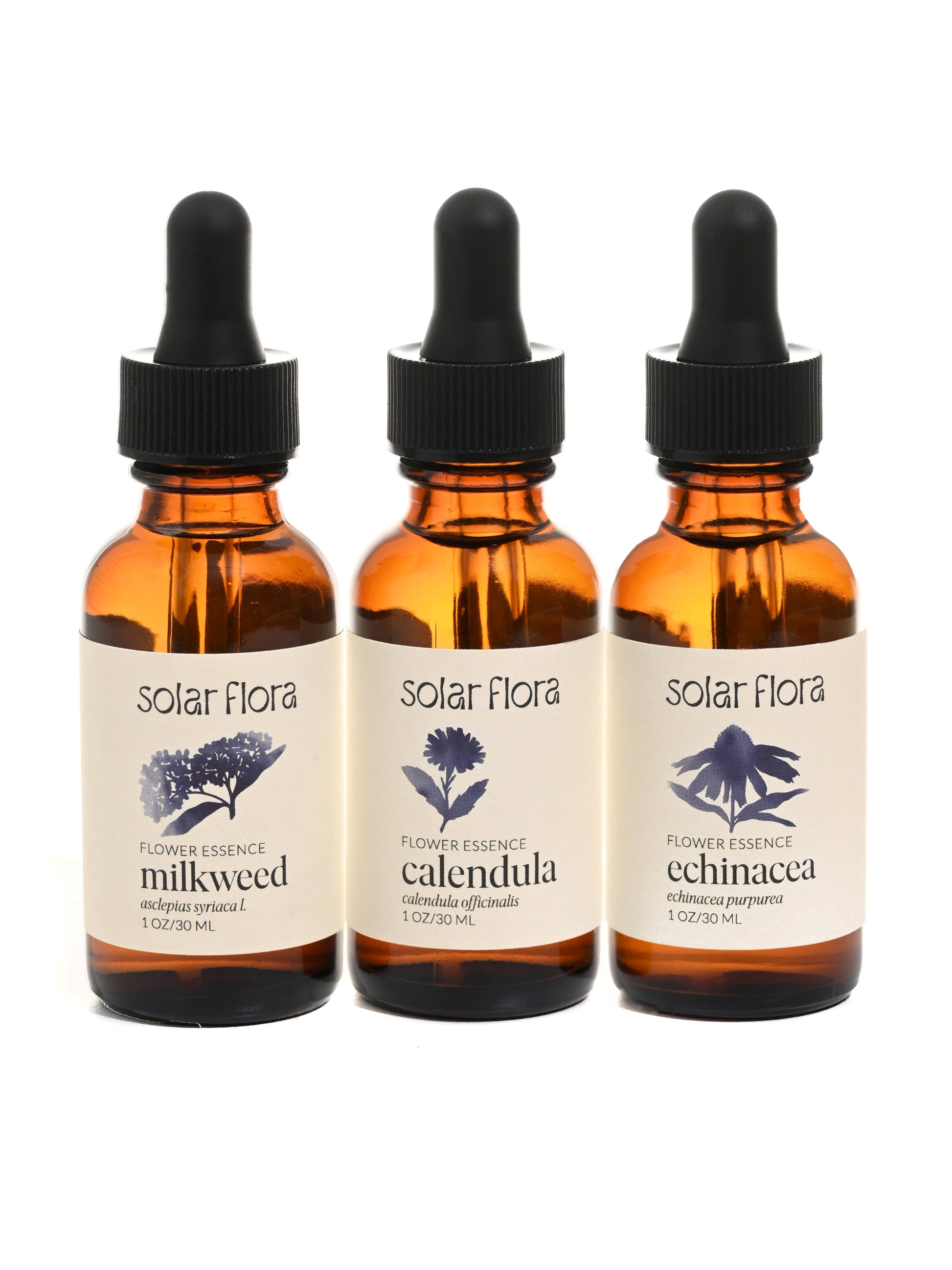 Bask in the luminous energy of summer with this radiant bundle of three flower essences, offered together at a special discounted price. Crafted during the peak of each blossom’s summer bloom, when nature’s vitality flows at its fullest, this trio carries the season’s abundant light into your daily life. Calendula’s golden warmth opens the heart, enhancing presence and fostering peaceful, heartfelt communication. Echinacea roots you in inner wholeness, awakening resilience, courage, and a vibrant vitality that strengthens your connections. Milkweed invites trust and surrender, weaving reciprocity and gentle support for transformation. Together, these essences form a harmonious current of warmth, strength, and grace—an alchemy of summer’s most radiant gifts to help you live, speak, and connect from your most luminous self.